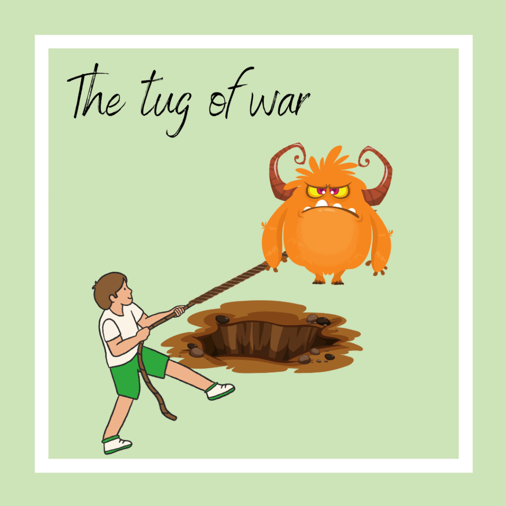 This ACT metaphor illustrates how struggling against your obsessions (the monster) is a never-ending fight, but Letting go of the rope and not engaging with your intrusive thoughts, accepting the presence of them and carrying on with your life while aligning to you values is your way to freedom.